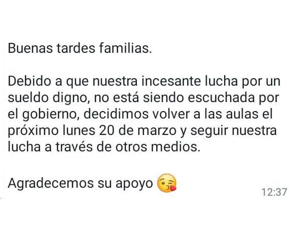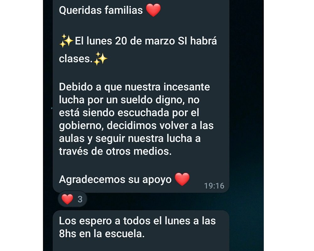 Hoy varios grupos de WhatsApp de padres/madres de la provincia recibieron mensajes que anunciaban la vuelta a clases este lunes.