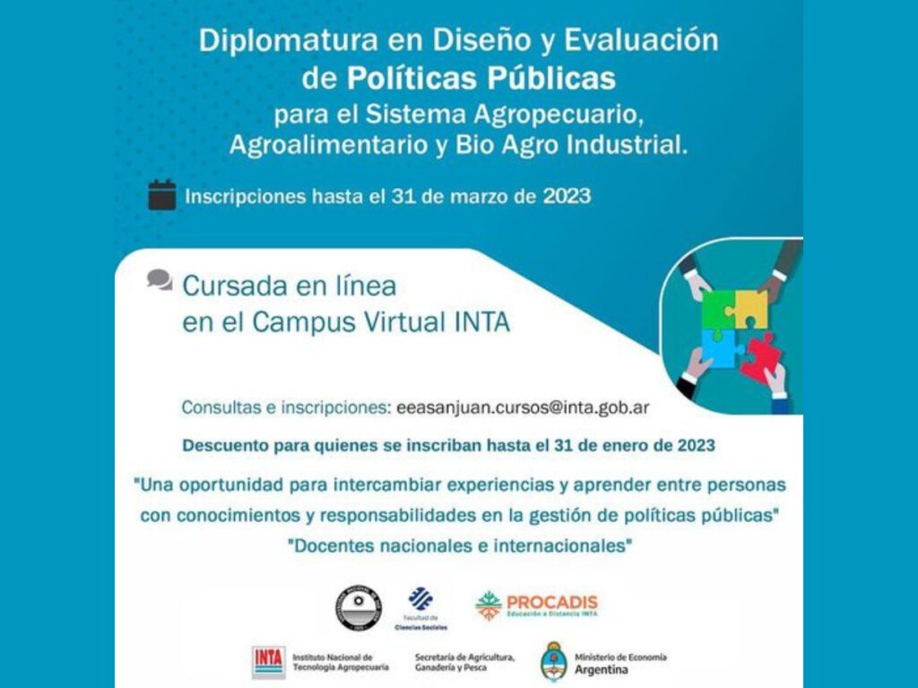 Por otro lado, la Facultad de Ciencias Sociales de la UNSJ informa que se encuentra abierta la inscripción para la Diplomatura en Diseño y Evaluación de Políticas Públicas para el Sistema Agropecuario, Agroalimentario y Bio Agro Industrial.