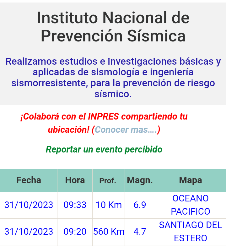 La primera información del INPRES es que el movimiento habría sido en el Océano Pacífico con una magnitud de 6.9 en la escala de Ritcher a 10 kilómetros.