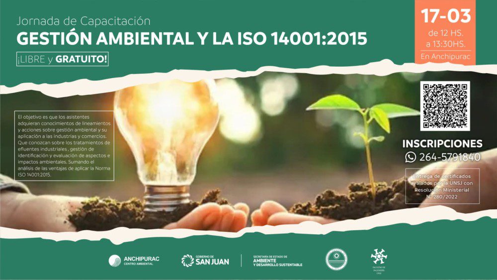 La Secretaría de Estado de Ambiente y Desarrollo Sustentable a través del Centro de Educación e Investigación Ambiental, en conjunto con la Universidad Nacional de San Juan, Facultac de Ingeniería Química, realizarán la capacitación y actualización de Gestión Ambiental y Liderazgo Sustentable. Se llevará a cabo los días 17 y 31 de marzo en Anchipurac.