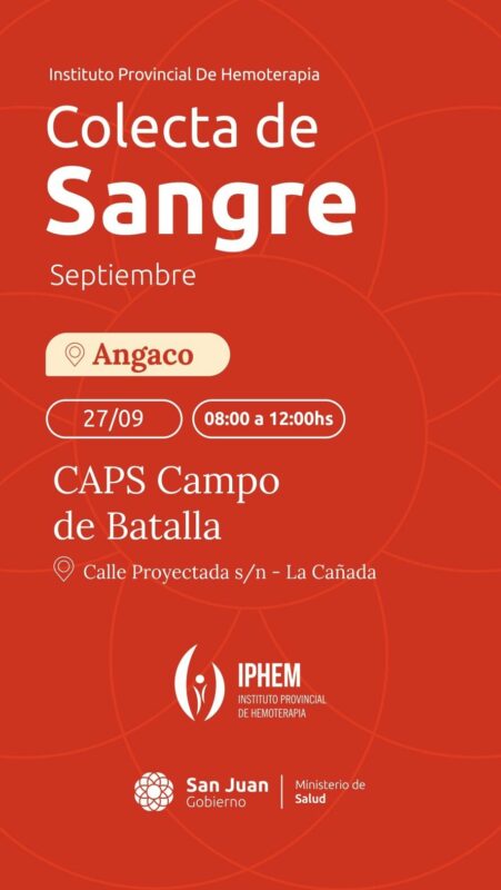 El Instituto de Hemoterapia acercará un operativo para la colecta de sangre en Angaco. La acción se realizará durante este viernes de 8 a 12.