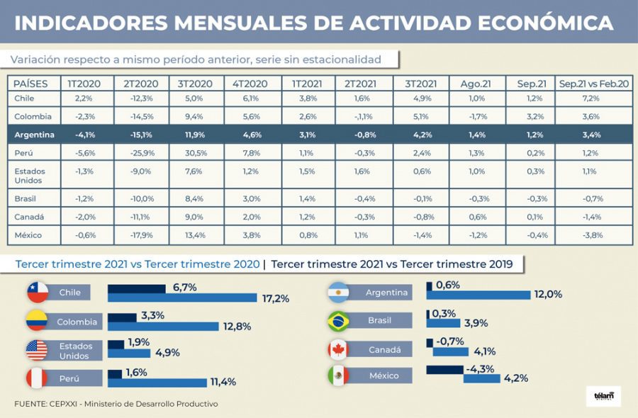 La economía argentina en septiembre creció 3,4% en comparación contra febrero de 2020, como último mes prepandemia, y entre las economías de mayor tamaño y producto de la región se posicionó por encima de Brasil y México, aunque por debajo de Chile y Colombia.