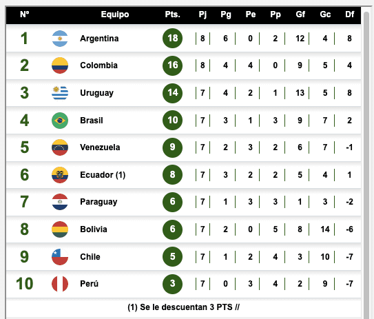 Argentina cayó en Barranquilla y Colombia disfrutó de su revancha de la final de la Copa América de Estados Unidos. El combinado cafetero se impuso por 2 a 1 gracias a los goles de Yerson Mosquera y James Rodríguez, de penal. Nico González había empatado transitoriamente para La Scaloneta. De todos modos, el combinado albiceleste se mantiene en la cima de la tabla de posiciones con 18 unidades. Los de Néstor Lorenzo, en tanto, mantuvieron su invicto en la competición y ocupan el segundo puesto con 16 unidades. El elenco criollo dejó en el camino una racha de 12 presentaciones sin conocer la derrota.