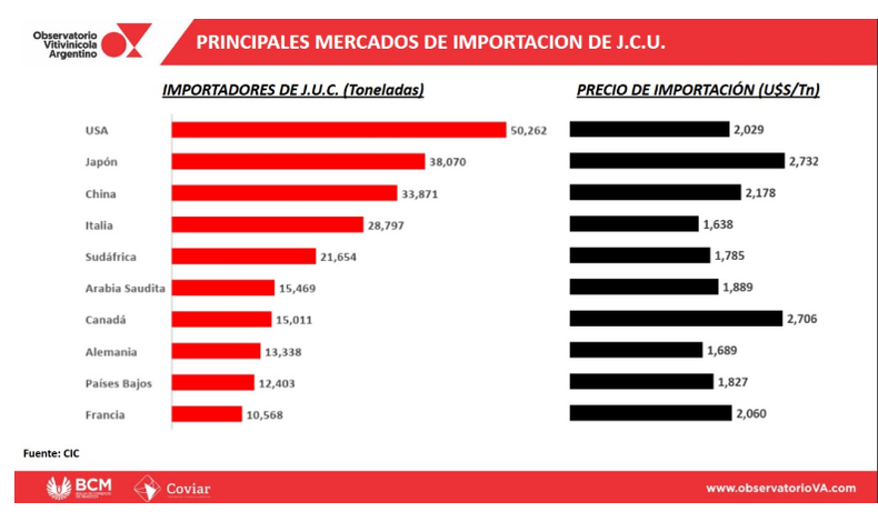 En el mundo el jugo concentrado de uva o mosto representa un comercio de 440.000 toneladas valuadas en U$S 660 millones. En este contexto, al 2024 Argentina es el segundo mayor exportador mundial con un total de 81.998 toneladas vendidas a un precio promedio de U$S1.598 la tonelada. El mayor exportador en 2024 es España con un total de 152.873 toneladas vendidas en 2024 a un valor promedio de 1.796 toneladas.