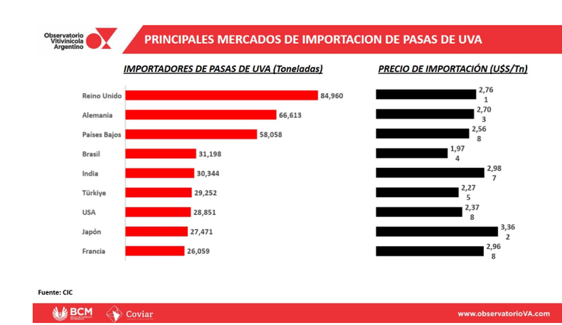 Las pasas de uva, por sus beneficios nutricionales, son un alimento cuya demanda crece en el mundo y ahí la vitivinicultura argentina tiene grandes posibilidades de crecimiento. Al 2024 en el mundo se comercializaron 871.494 toneladas de pasas de uva por un valor total de U$S2.029 millones. En 2024 Argentina logró un nuevo récord en exportaciones de pasas al alcanzar el mayor volumen vendido en toda la serie histórica.