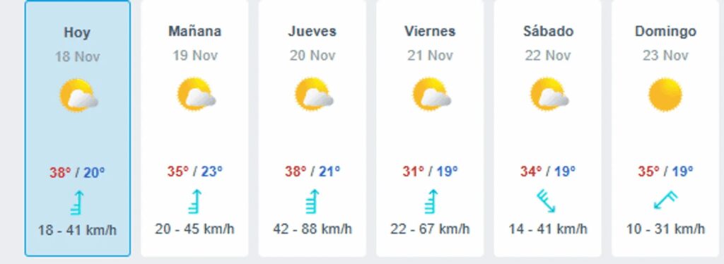 Del mismo modo, aludieron que el viento continuará durante la jornada del miércoles con mayor velocidad durante horas de la siesta. Esto llevará a que la temperatura baje, por lo que se posicionará en los 35º. Para el jueves y el viernes el viento será superior y podría superar ráfagas de los 70 km/h.