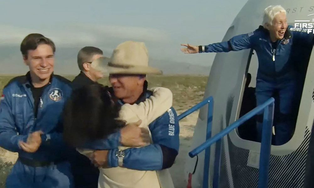 «¡Es increíble!», «¡Ay Dios!», gritaron los cuatro casi al mismo tiempo cuando la New Shepard pasó los 100 kilómetros de la Tierra, alcanzó la gravedad cero y sus cuerpos comenzaron a flotar. Emocionada, Wally Funk, la mayor del grupo, se abalanzó sobre Bezos para abrazarlo mientras a un costado Oliver Daemenen, el menor, daba vueltas carnero. Los cuatro tripulantes se chocaron dentro del pequeño habitáculo y gritaron de felicidad. Alguien lanzó pelotitas de color naranja que contrastaban con el azul eléctrico de sus trajes.