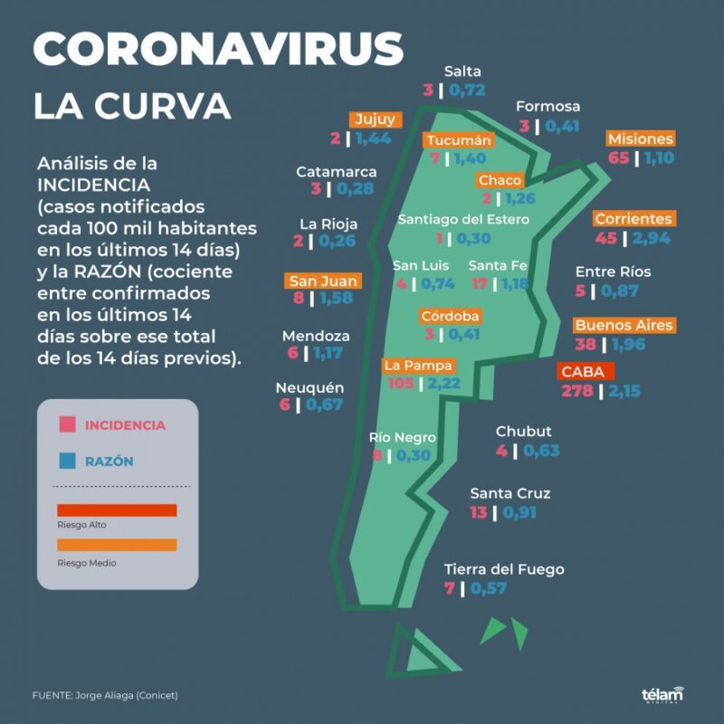 «Al analizar los datos publicados este lunes en la base del Ministerio, lo que se encuentra es que la Ciudad de Buenos Aires presenta una incidencia de 278 casos notificados cada cien mil habitantes en los últimos 14 días, y que la razón está en 2,15, con lo cual la combinación de esos valores arroja un riesgo alto», explicó Aliaga.
