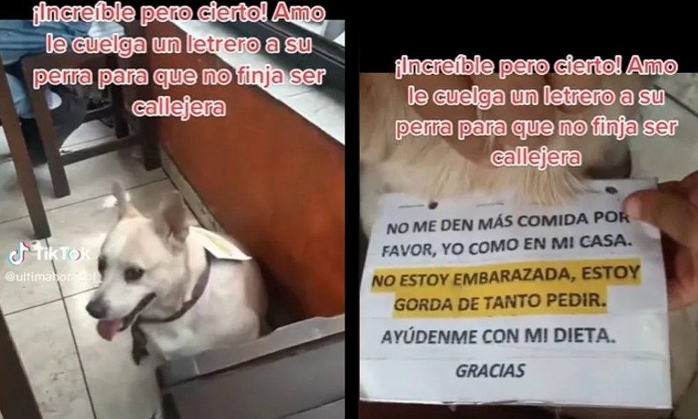 «No me den más comida, por favor, yo como en mi casa. No estoy embarazada, estoy gorda de tanto pedir, ayúdame con mi dieta. Gracias”, cita el cartel que tiene una perra. El viral fue publicado por la cuenta de TikTok@ultimahoracol.