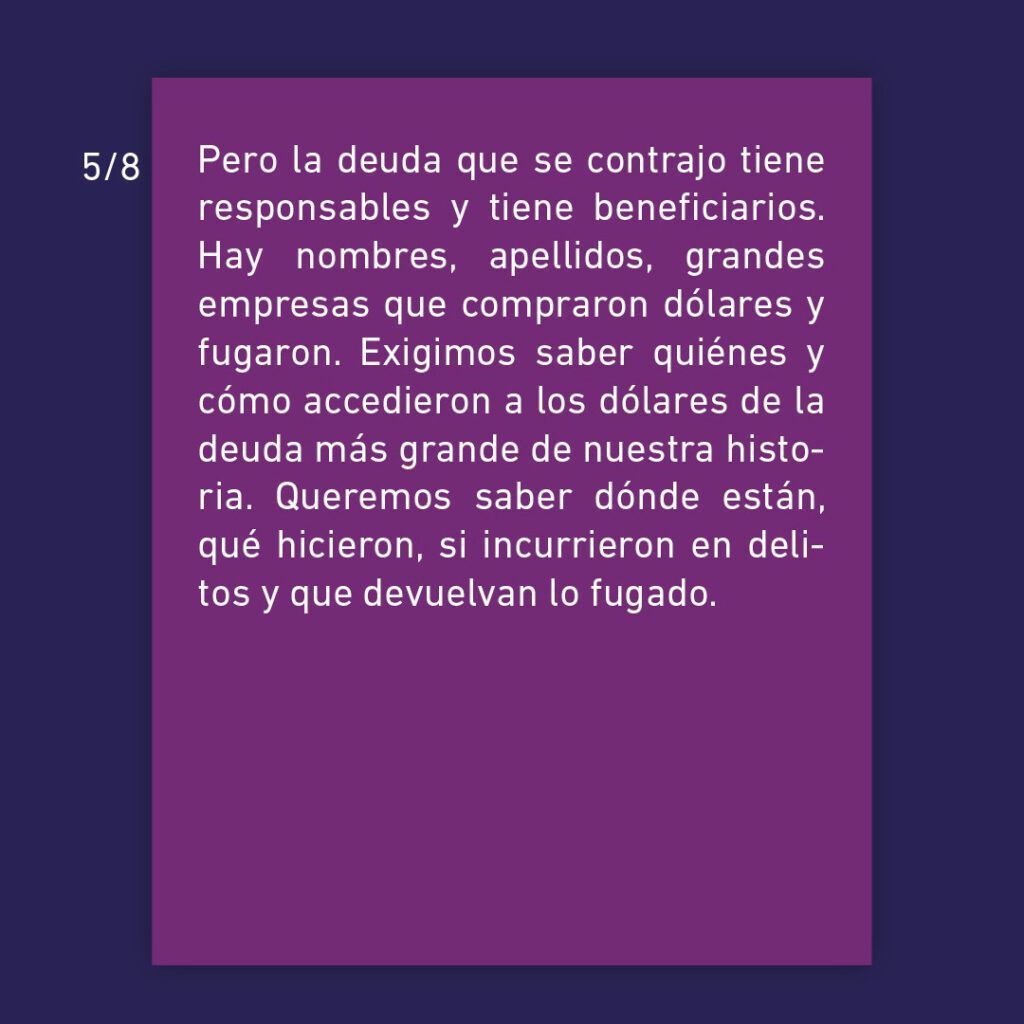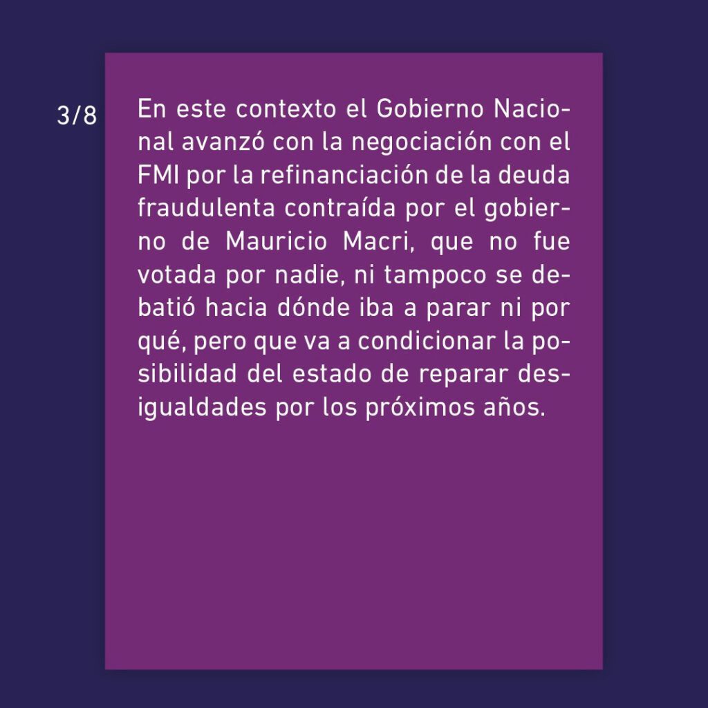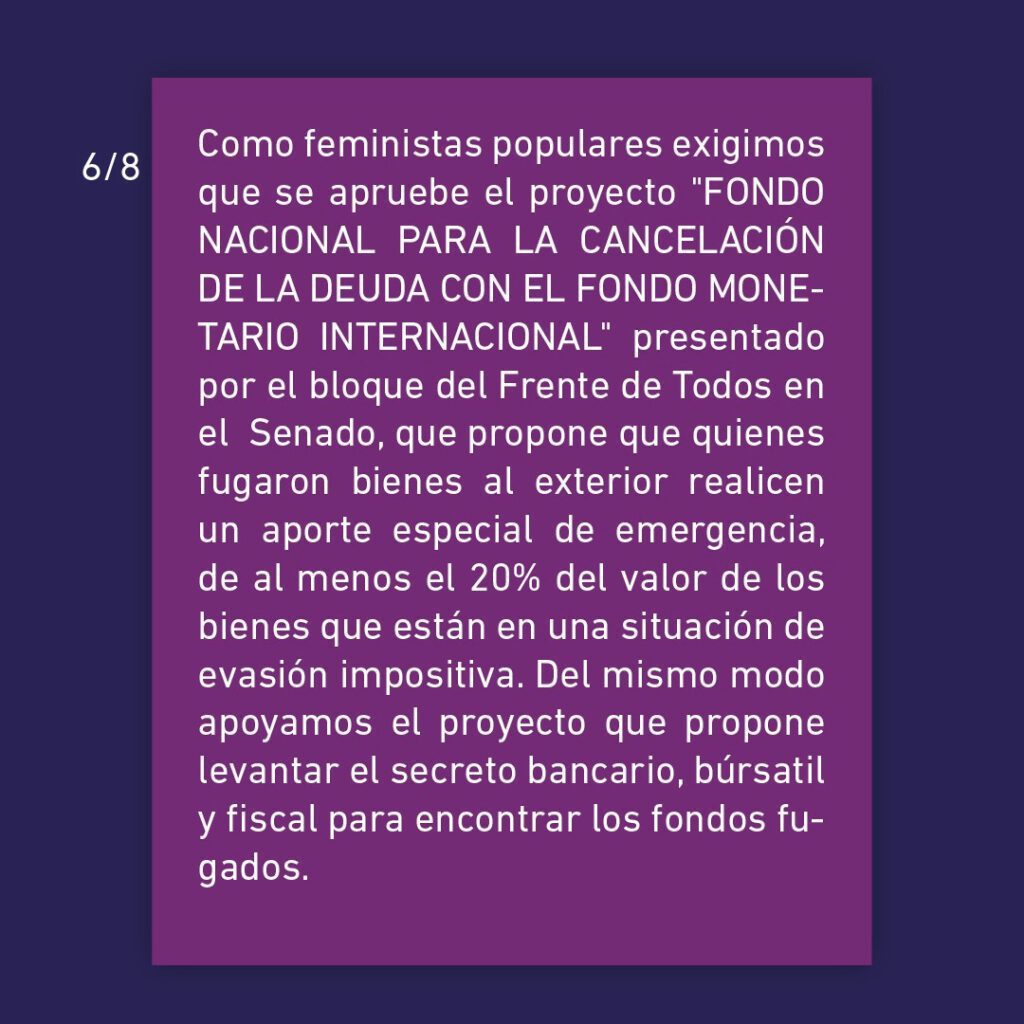 «Con el Feminismo Popular exigimos que se apruebe el proyecto: Fondo Nacional para la Cancelación de la Deuda con el Fondo Monetario Internacional; presentado por el bloque del Frente de Todos en el Senado, que propone que quienes fugaron los bienes al exterior realicen un aporte especial de emergencia, de al menos el 20% del valor de los bienes que están en una situación de evasión impositiva», exigen los adherentes en el Manifiesto.