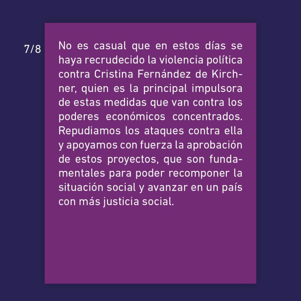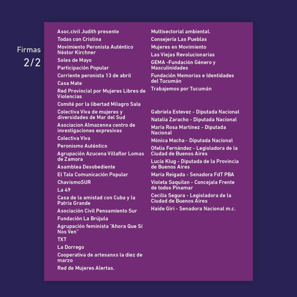 Además, el Manifiesto repudia la violencia que ha sufrido la vicepresidenta de la Nación, Cristina Fernández de Kirchner.
