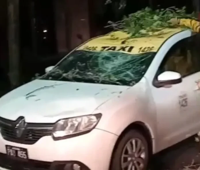 De acuerdo con el relato de testigos, el taxi se encontraba detenido cuando la rama se desprendió del árbol y se desplomó sobre el parabrisas, destruyéndolo por completo y dañando también parte del techo del vehículo.
