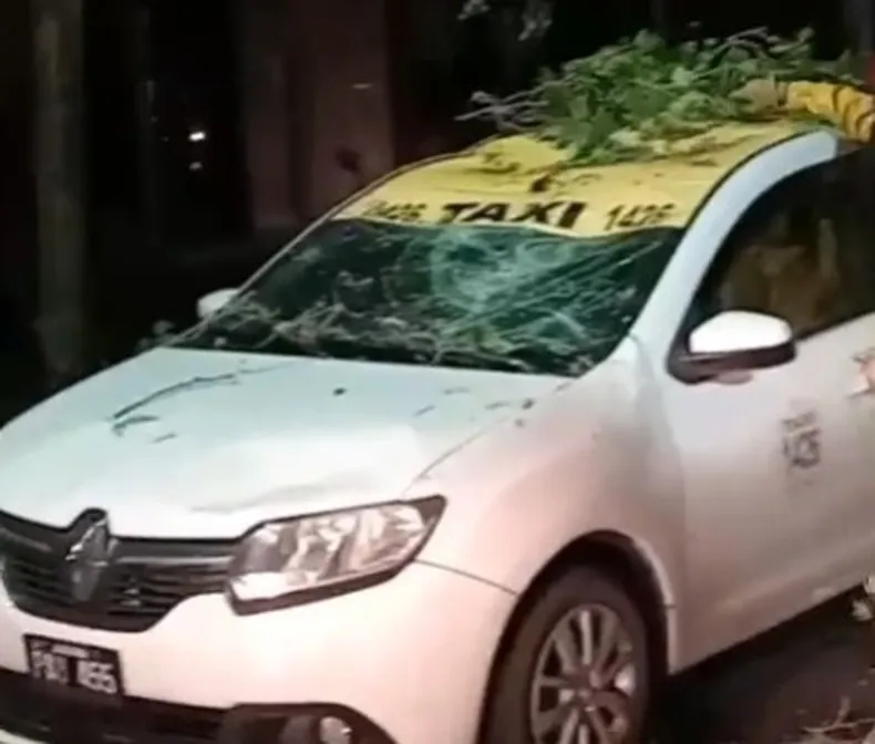 Un grave incidente registrado durante la noche de este jueves, en medio de la tormenta, en la Capital, no terminó en tragedia de milagro. Mientras un taxi aguardaba el cambio del semáforo para cruzar una esquina del microcentro, una enorme rama cayó repentinamente sobre el vehículo.