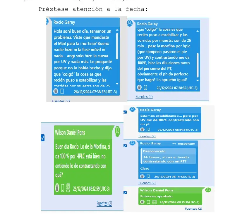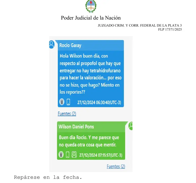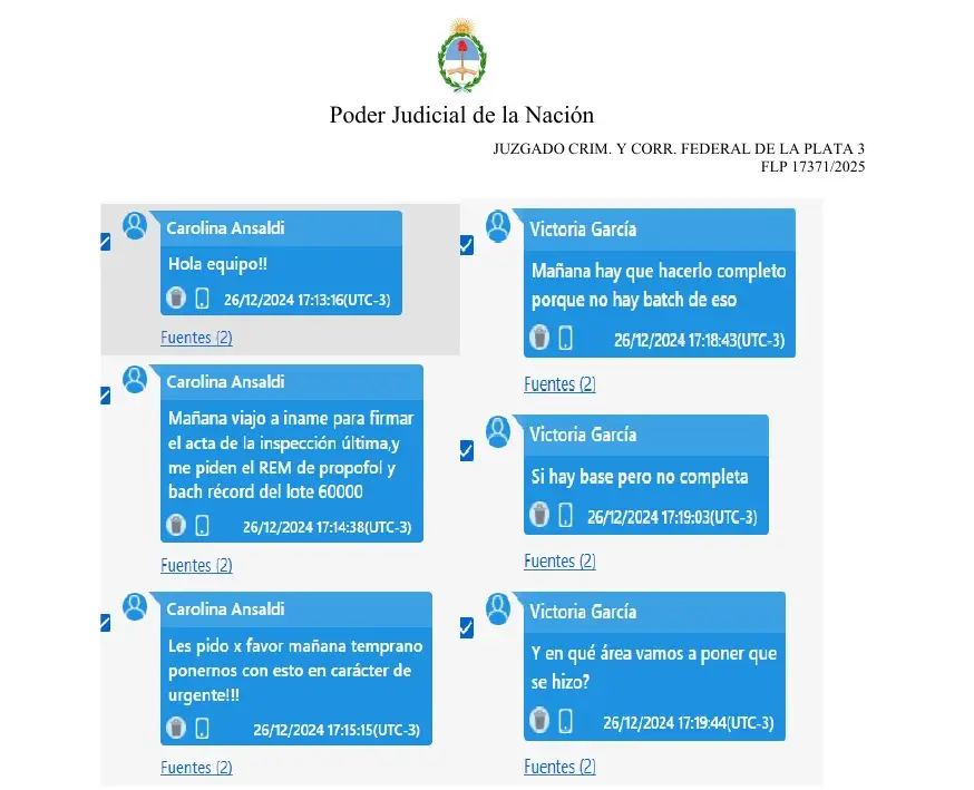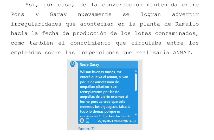 Por ejemplo, en una conversación entre el ingeniero químico Wilson Pons y Rocío Garay, supervisora de Control de Calidad de Laboratorios Ramallo SA, “nuevamente se logran advertir irregularidades que acontecían en la planta de Ramallo hacia la fecha de producción de los lotes contaminados, como también el conocimiento que circulaba entre los empleados sobre las inspecciones que realizaría ANMAT”.