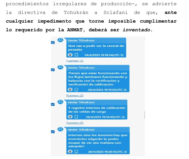 “En otro pasaje, pero siempre con referencia a las deficiencias del laboratorio en cuanto al manejo de los registros -aunque vinculado de suyo a los procedimientos irregulares de producción-, se advierte la directiva de Tchukrán a Sclafani de que, ante cualquier impedimento que torne imposible cumplimentar lo requerido por la ANMAT, deberá ser inventado”, menciona el juez en la resolución. Acto seguido aclara que “los dueños tenían pleno conocimiento de la situación” en que se encontraba el laboratorio.