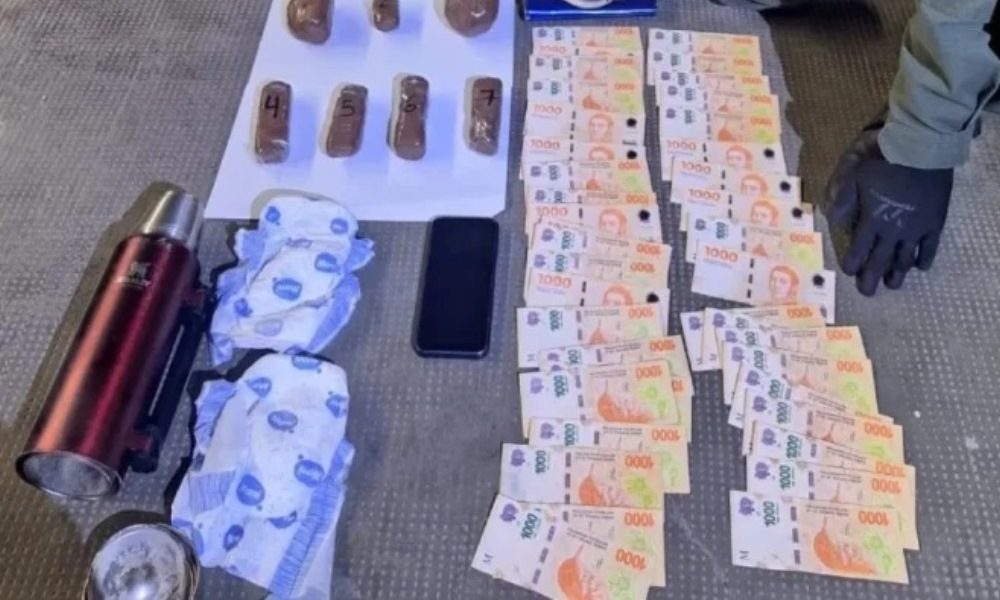 Utilizando una herramienta de corte, se abrió el termo extrayendo cuatro paquetes más. Tras efectuar la prueba de orientación de campo, Narcotest, arrojó resultado positivo en cocaína, mientras que el pesaje fue de 1 kilo 188 gramos. También se incautó 94.000 pesos y un celular.