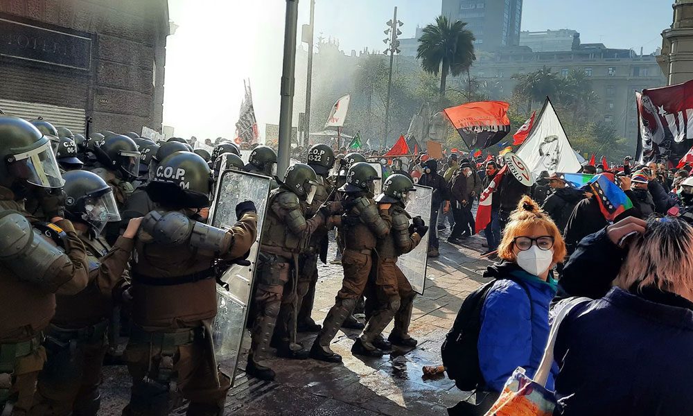 Las marchas y manifestaciones fueron convocados temprano, por distintas colectivos y agrupaciones sociales y políticas, para acompañar la ceremonia de inauguración de la Convención. «No están todos faltan los presos», fue el grito que más se escuchó en Plaza Dignidad uno de los puntos de encuentro de los manifestantes.