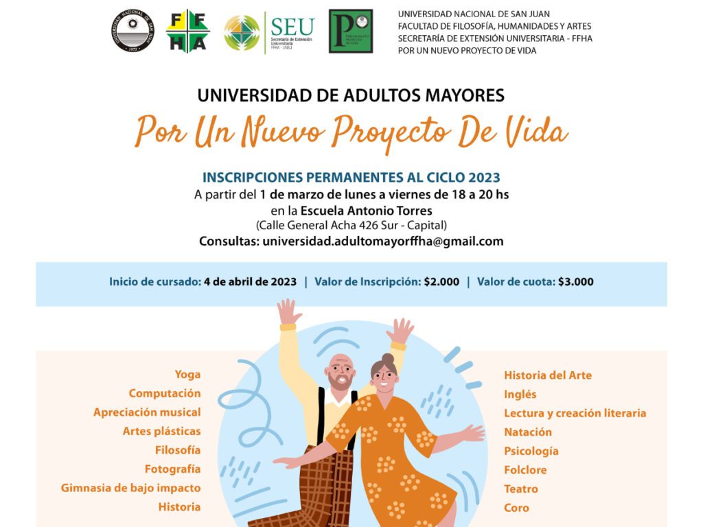 Iniciaron las inscripciones al ciclo 2023 para los Talleres de la Universidad para Adultos Mayores «Por un nuevo proyecto de vida» dependiente de la Secretaría de Extensión Universitaria de la Facultad de Filosofía, Humanidades y Artes de la Universidad Nacional de San Juan. Las inscripciones se realizarán de lunes a viernes de 18 a 20 h en la Escuela Antonio Torres, ubicada en General Acha 426 Sur, Capital.