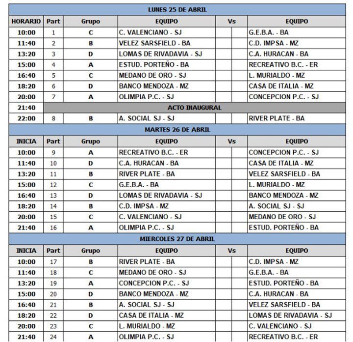 - Zona B: Social San Juan, River Plate (BA), IMPSA (MZA), Vélez Sarsfield (BA)