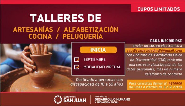 En este marco, el Ministerio de Desarrollo Humano y Promoción Social, a través de la Dirección de Personas con Discapacidad, vuelve el dictado de los talleres de artesanías, alfabetización, cocina y peluquería para personas de entre 18 a 55 años inclusive.