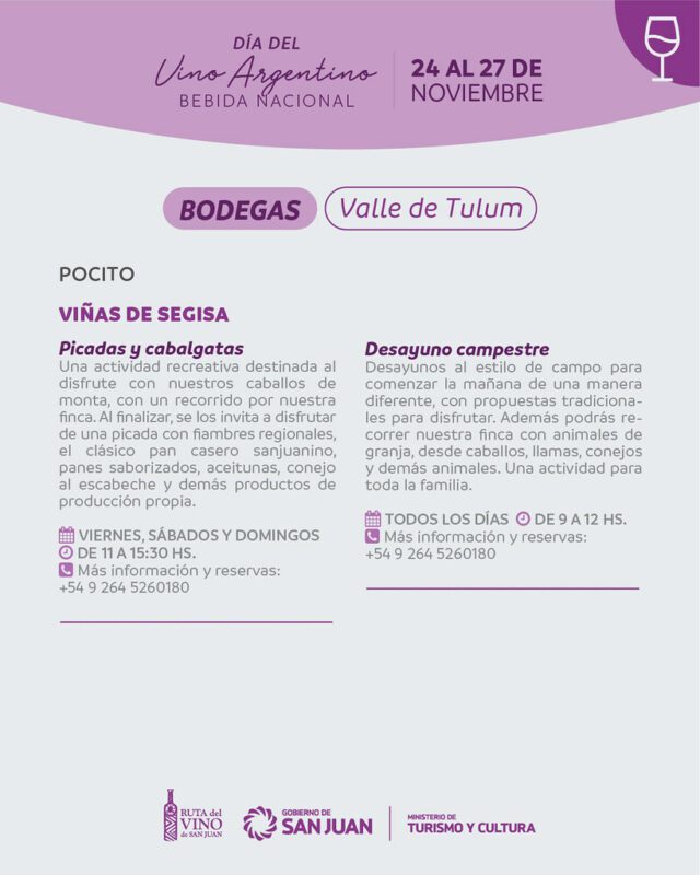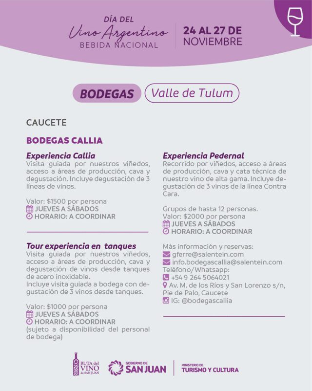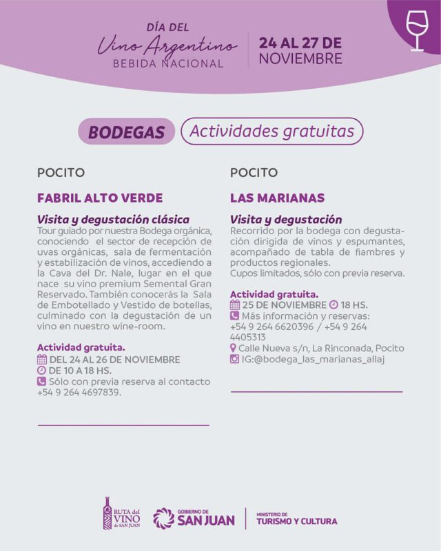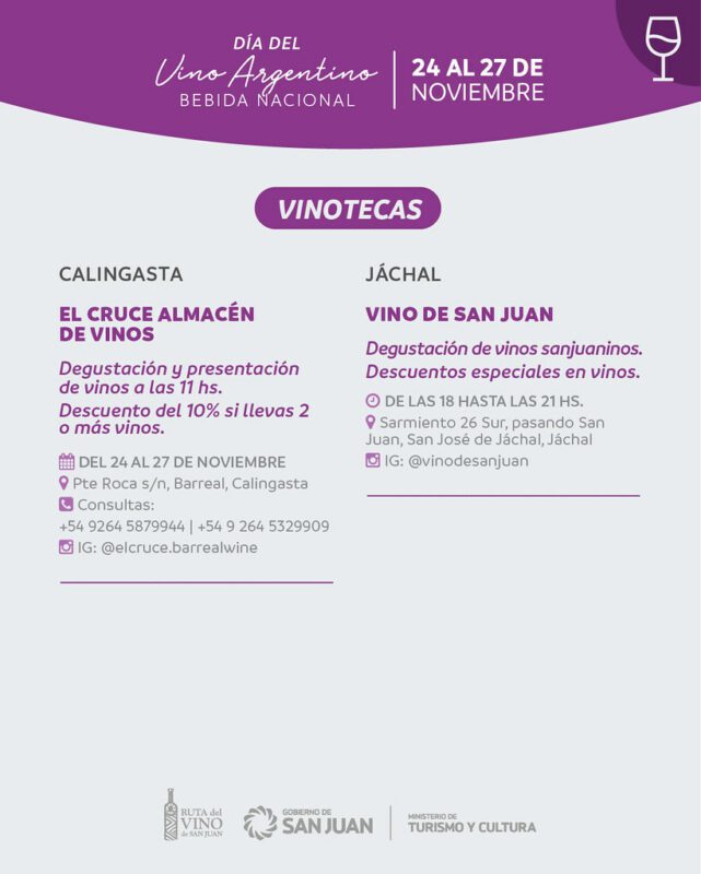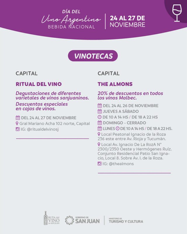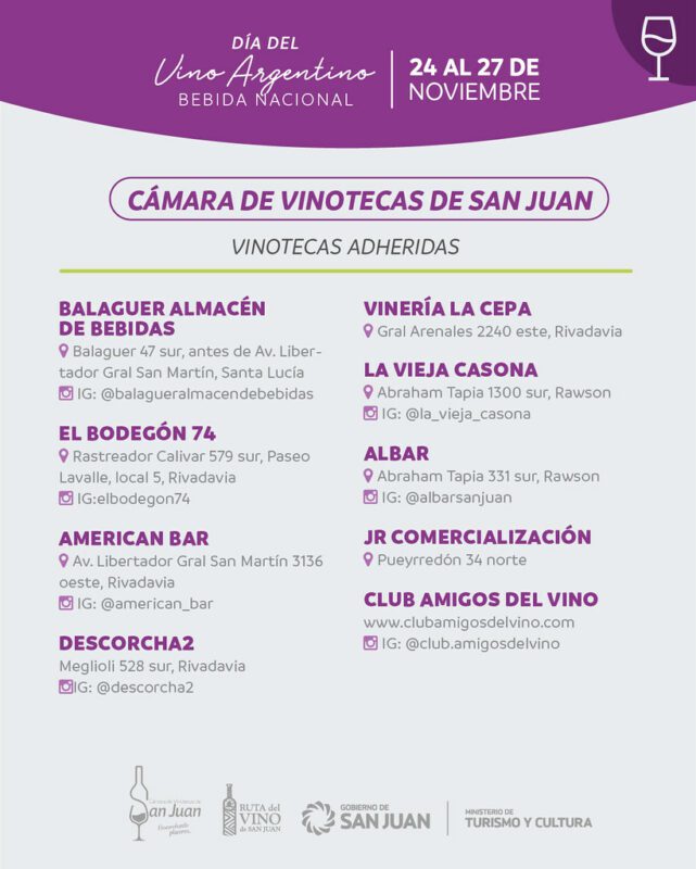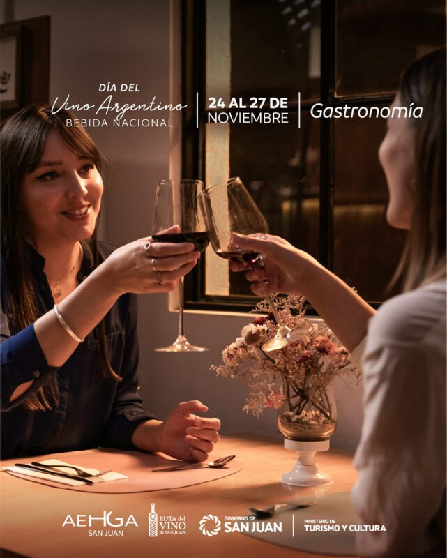 Este jueves 24 de noviembre se celebra el Día del Vino Argentino en todo el país. En nuestra provincia, la Asociación Empresarial Hotelera Gastronómica de San Juan; la Cámara de Vinotecas y las bodegas, en su totalidad de la Ruta del Vino de San Juan, tienen planeadas una serie de actividades que se extenderán hasta el 27 de noviembre.