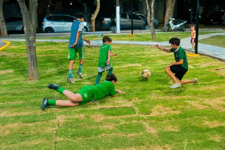 La intervención integral en la plaza del barrio Gemo II contempló la ejecución de 150 metros cuadrados de veredas con hormigón H17, junto a la construcción de 100 metros lineales de cordones perimetrales, 60 metros cuadrados de banquina y 60 metros lineales de cordones delimitadores de espacios internos, lo que permitió ordenar y jerarquizar el uso del predio. Además, se construyeron puentes rampa para mejorar la accesibilidad y se incorporaron juegos infantiles y nuevos aparatos de salud, promoviendo espacios inclusivos para el esparcimiento y la actividad física.