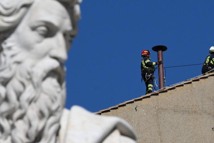 Los bomberos de la Ciudad del Vaticano instalaron la chimenea en el techo de la Capilla Sixtina de la cual, a partir del 7 de mayo, saldrá el humo que anoticiará sobre los resultados de las votaciones de cardenales para la elección de un nuevo Papa.