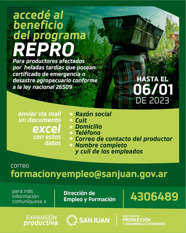 El Ministerio de Producción y Desarrollo Económico convoca a los productores afectados por las heladas tardías del 1 de noviembre que posean el certificado de emergencia o desastre agropecuario que se tramita en la Dirección de Riego, Contingencias Climáticas y Economía Agropecuaria a que presenten la documentación necesaria para poder acceder al beneficio del REPRO.