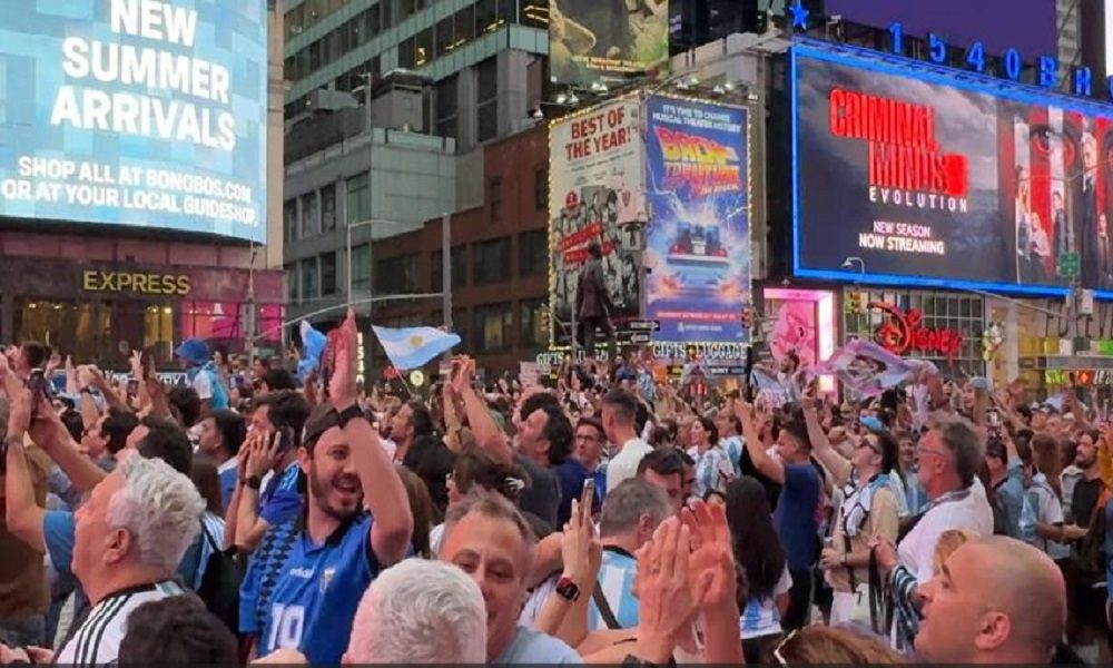 Miles de personas se reunieron con camisetas, bombos y banderas en el mítico Times Square para alentar al combinado campeón del mundo, antes del partido ante Chile.