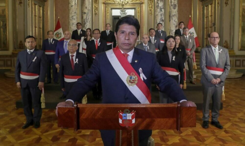 El presidente de Perú, Pedro Castillo, anunció este miércoles que disuelve el Congreso, horas antes de que el órgano legislativo debatiera una moción de destitución en su contra, y declaró un «Gobierno de excepción» y un «toque de queda a nivel nacional», lo que motivó inmediatamente la renuncia de ministros y acusaciones de la oposición de un «golpe de Estado».