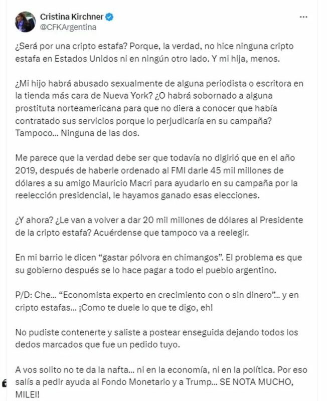 Luego mencionó el decisivo rol de Donald Trump para el préstamo otorgado por el FMI al gobierno de Mauricio Macri en 2018 y le hizo una advertencia al presidente estadounidense: «¿Y ahora? ¿Le van a volver a dar 20 mil millones de dólares al Presidente de la cripto estafa? Acuérdense que tampoco va a reelegir«.