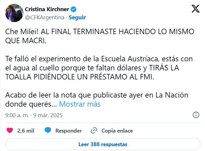 La expresidenta Cristina Fernández de Kirchner criticó este domingo a Javier Milei por la columna de opinión que publicó sobre el acuerdo con el Fondo Monetario Internacional (FMI), en la que el mandatario justificó el endeudamiento con el organismo internacional asegurando que es para “sanear el BCRA» y así «terminar» con la inflación. «Al final terminaste haciendo lo mismo que Macri. Te falló el experimento de la Escuela Austríaca, estás con el agua al cuello porque te faltan dólares y tirás la toalla pidiéndole un préstamo al FMI«, lo desafió CFK por redes sociales y agregó: «Dejá de mentirle a la gente».