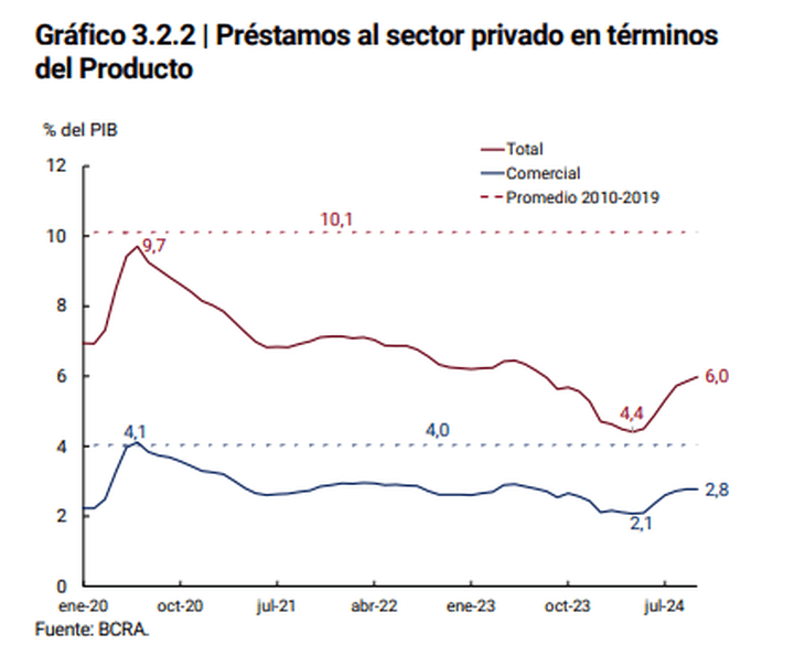 «En términos del PBI, el crédito al sector privado habría ascendido a 6%, acumulando un aumento de 1,6 puntos porcentuales en el último semestre», señaló el informe del BCRA. En abril, el ratio de préstamos sobre el producto había tocado un piso del 4,4%.