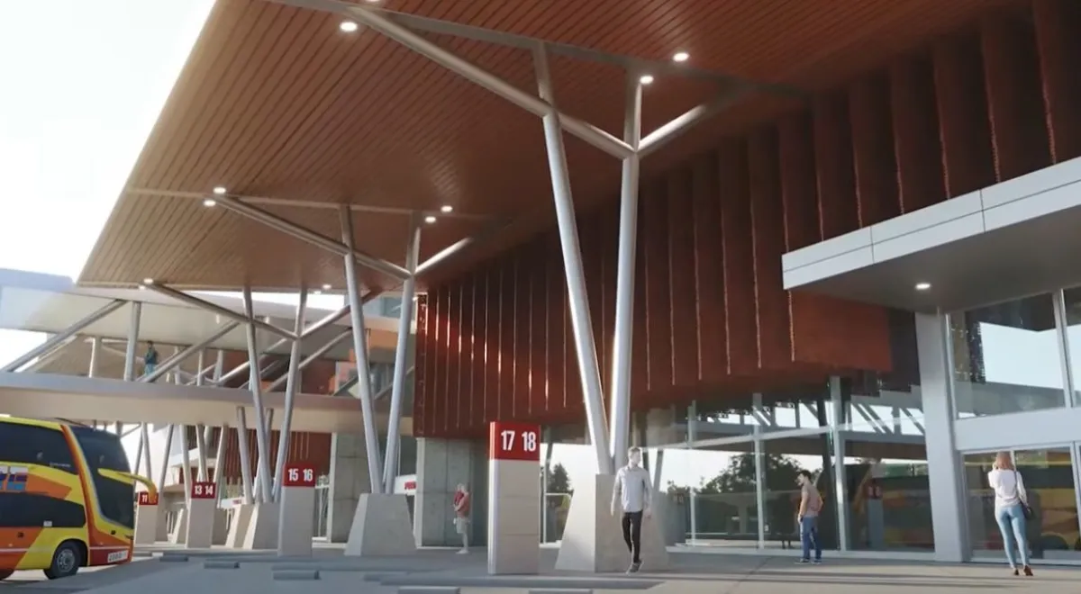 Según el pliego “el proyecto propone la conservación de la terminal histórica que data de 1973, reservando su vínculo con la provincia y aprovechando su estructura y servicios existentes, lo que representa un gran ahorro en los costos de construcción. La nueva Terminal se expandirá a un segundo edificio, el cual articulará el arribo y partida de los viajes nacionales e internacionales, mientras que los viajes interprovinciales, continuarán en el edificio actual. De esta manera, de una superficie actual de 4.170 m2, la Nueva Terminal pasará a tener más de 14.000 m2, cubiertos y semicubiertos. Esta expansión, permite más de 20 nuevas dársenas de arribo de colectivos, y un nuevo sector gastronómico comercial, con más de 10 salones comerciales, patio de juegos recreativos, patio de comidas y dos terrazas que se abrirán a la plaza Di Stéfano. Estos dos edificios serán vinculados, por un puente peatonal de más de 75 metros de longitud, para permitir el traslado entre ambos edificios de manera segura y rápida”.