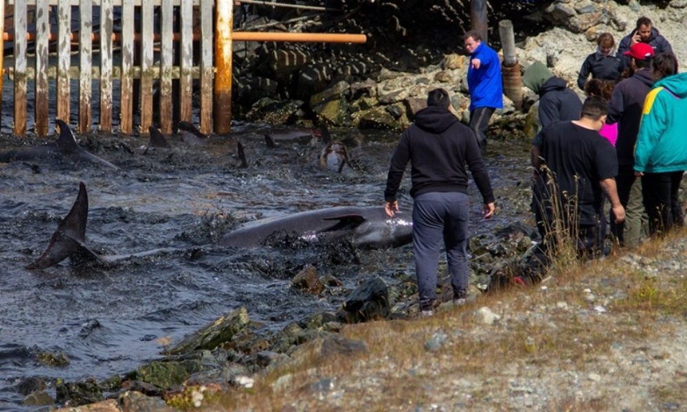 Un grupo de cetáceos de la familia de los delfines encalló en la bahía de Ushuaia este domingo, debido a la intensidad del viento.