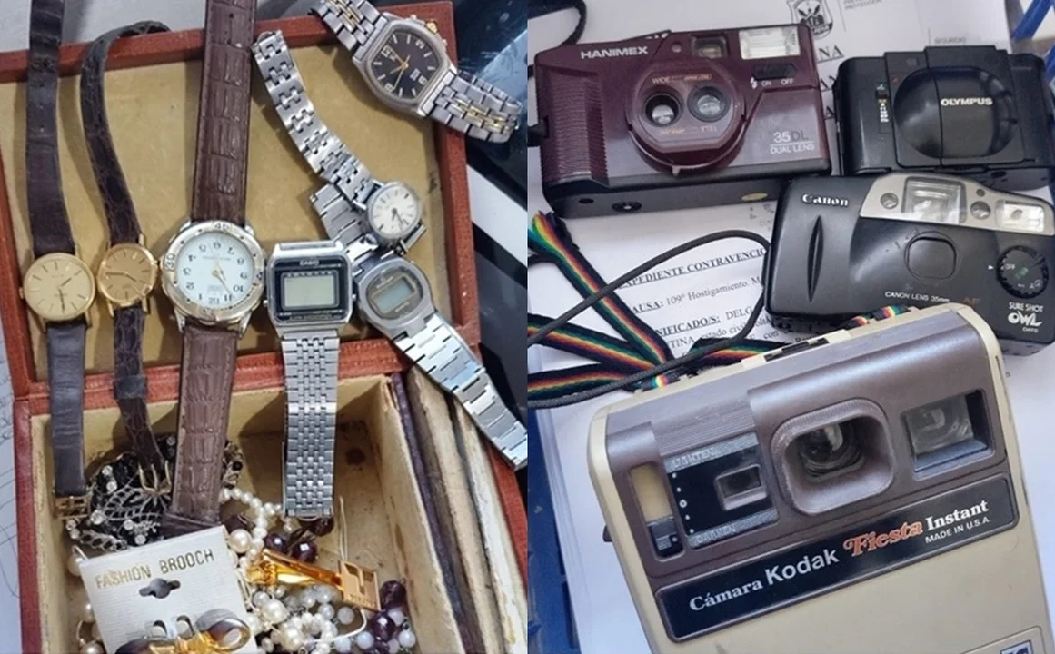 Dentro de la mochila hallaron cuatro cámaras fotográficas de distintas marcas (Havimen, Olympus, Canon y Kodak), además de relojes, collares, pulseras, medallas religiosas y una cámara instantánea, entre otros elementos de valor.