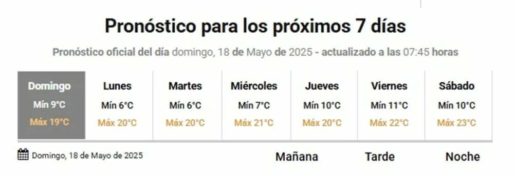 Según lo que publicaron desde el Servicio Meteorológico Nacional en su página web, este 18 de mayo el termómetro irá desde los 9° hasta los 19 grados centígrados. En horas de la mañana se prevé que el cielo esté algo nublado, con un viento del sureste que registrará velocidades que oscilarán entre los 23 y 31 kilómetros por hora.
