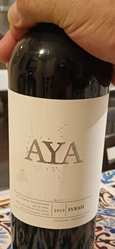 Aya Syrah: Color rojo rubí con tintes violetas. Aromas que recuerdan a moras, confituras y especias, en equilibrio con la vainilla y el humo aportados por la madera. En boca tiene un excelente cuerpo, con taninos persistentes y robustos. Es un vino de bodegas Bórbore que combina uvas del Valle de Pedernal (1.200 msnm), Valle de Zonda (900 msnm) y San Martín en el Valle de Tulum (700 msnm). Se cosecha en bins de 400 kilos los últimos días de Enero en Zonda, los primeros días de Marzo en San Martín y la segunda quincena de Abril en Pedernal. Su conservación y crianza se realiza en roble francés de primer uso. Precio aproximado: $9.500.