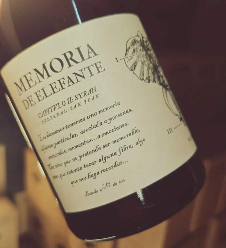Memoria de Elefante Syrah 2022: proviene de uvas del Valle de Pedernal (1400 msnm) de un viñedo plantado en el 2001. Su suelo es suelto, con mucha piedra, calcáreo y con algo de limo. La cosecha fue manual, en cajas; el 25 de marzo del 2022. La vinificación y crianza se hizo con uva 100% despalillada, macerado en frío y luego fermentó el grano entero en un tanque de acero inoxidable . Se hizo una corta maceración post fermentativa y se crió durante 12 meses en barrica de Roble francés usadas. El enólogo Felipe Azcona destaca que en nariz se presenta compacto con una primera impresión de tabaco y pimienta y luego aparecen aromas a eucalipto, balsámicos, higos y ciruela tiernizada. En boca ingresa con volumen e intensidad. Su precio aproximado: $19.000.