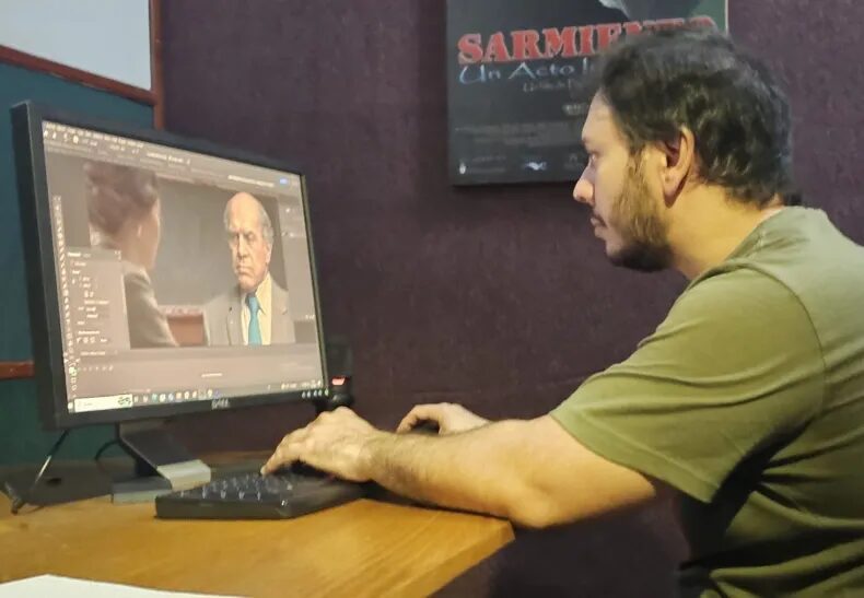 «Es un largometraje que mezclará lugares reales de San Juan que ya los tenemos estudiados para que no pierda el ambiente de la epoca y tambien trabajaremos con actores con la técnica de filmación tradicional. Eso le vamos sumar la imagen de Sarmiento realizada con Inteligencia Artificial en su totalidad» empieza contando Sebastián que trabaja casi 10 horas por día.