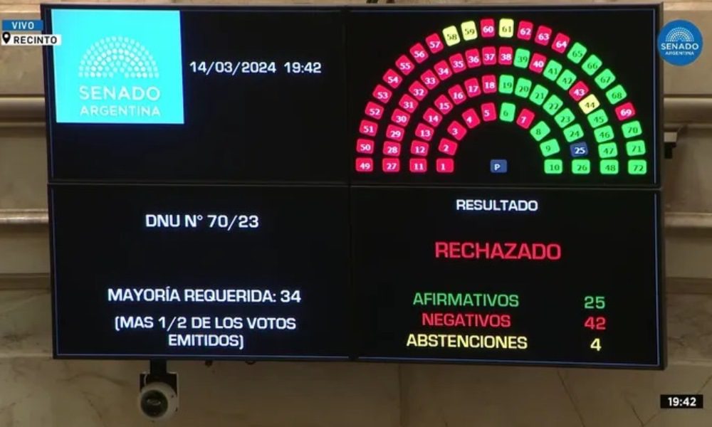El Senado voto en un notable rechacho al Decreto de Necesidad y Urgencia 70/2023. 42 votos contra 25.