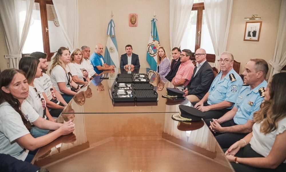 Con motivo de la entrega de tecnología para reforzar la prevención en seguridad vial, el gobernador Marcelo Orrego recibió en Casa de Gobierno a la ministra de Gobierno, Laura Palma; el secretario de Seguridad, Gustavo Sánchez y el jefe de la Policía, Eduardo Lirola. Además acompañaron representantes de la Asociación Familias del Dolor y la Esperanza.