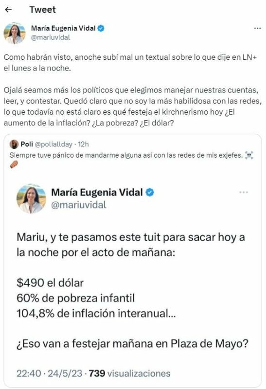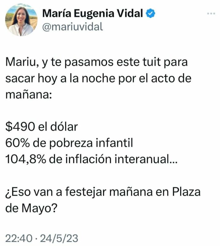 “Mariu, te pasamos este tuit para sacar hoy a la noche por el acto de mañana: $490 el dólar. 60% de pobreza infantil. 104,8% de inflación interanual… ¿Eso van a festejar mañana en Plaza de Mayo?», decía el mensaje completo, que si bien fue borrado a los pocos minutos, tuvo capturas y se volvió viral rápidamente.