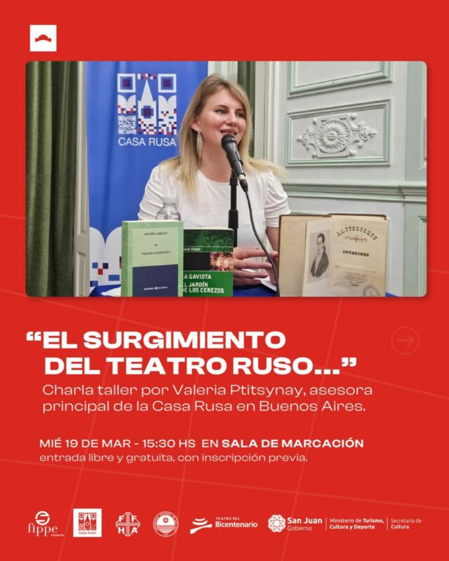 La Fundación Ideas para Promover la Equidad (FIPPE) invita a la charla taller sobre teatro ruso que brindará Valeria Ptitsynay, asesora principal de la Casa Rusa en Buenos Aires, titulada “El surgimiento del Teatro Ruso y el Sistema Stanislavski para actores, recorrido por la vida y la obra de los máximos dramaturgos rusos: Griboyédoy y Chéjov”. La misma está destinada a estudiantes, actores, escritores y público en general.