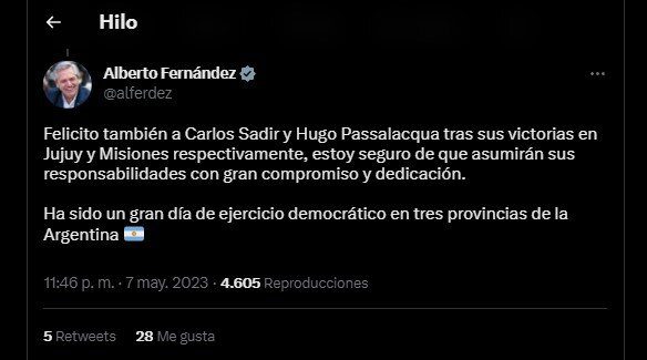 El presidente Alberto Fernández felicitó a Carlos Sadir luego de cerrados los comicios en Jujuy.