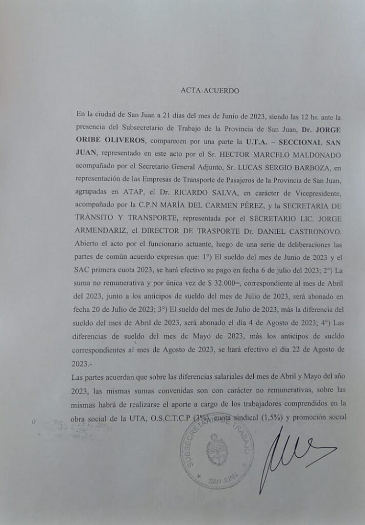 El acta finalmente fue suscripta por la Unión Traviarios Automotor (UTA) y la Federación Argentina de Transportadores por Automotor de Pasajeros (Fatap). Todo se llevó adelante en la Subsecretaría de Trabajo.