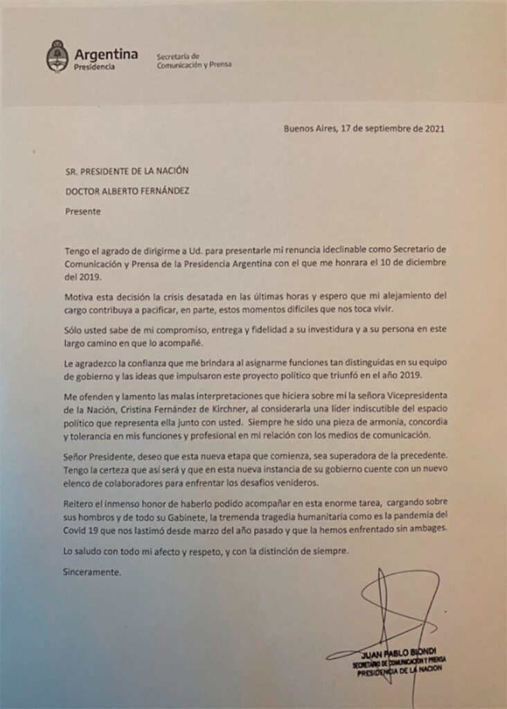El Secretario de Comunicación y Prensa de la Presidencia, Juan Pablo Biondi, uno de los funcionarios más criticados del Gobierno de Alberto Fernández presentó esta tarde su renuncia «ideclinable», con una mención especial para la vicepresidenta Cristina Fernández de Kirchner.