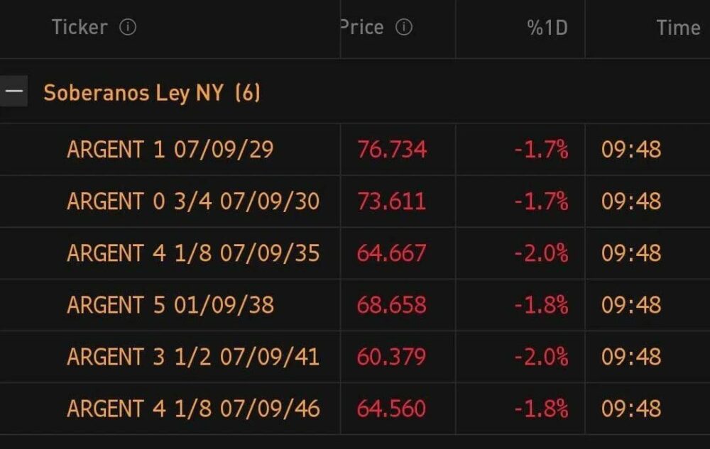 Antes de la apertura del mercado en Wall Street, las acciones de Grupo Financiero Galicia ceden 7%; seguido por Grupo Supervielle (-6,4%), Banco Macro (-4,4%) y Transportadora de Gas del Sur (-4,3%). En el caso de los bonos, las series nominados en dólares también marcan nota negativa con bajas de hasta 2,1% y las lidera el Global 2035 (GD35), seguido por el Global 2041 (GD41) que baja -2%.