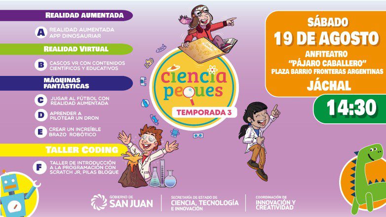 El programa Ciencia Peques estará este fin de semana en Jáchal. Desde las 14:30 hs. lo último en ciencia, tecnología e innovación arribará al anfiteatro “Pájaro Cáballero”, ubicado en la plaza del barrio Fronteras Argentinas de aquel departamento.