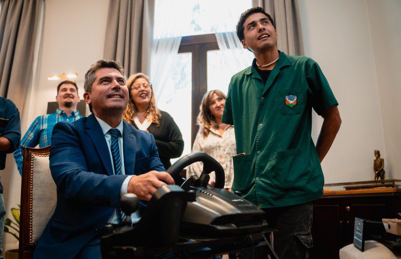 Durante la visita, el Gobernador no sólo observó cómo funcionan los robots, sino que se animó a probar el simulador de manejo, mientras los jóvenes le explicaron cómo lo desarrollaron.